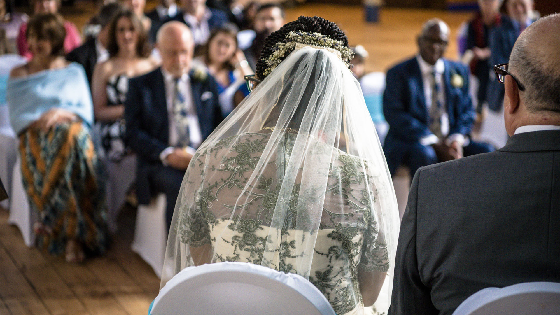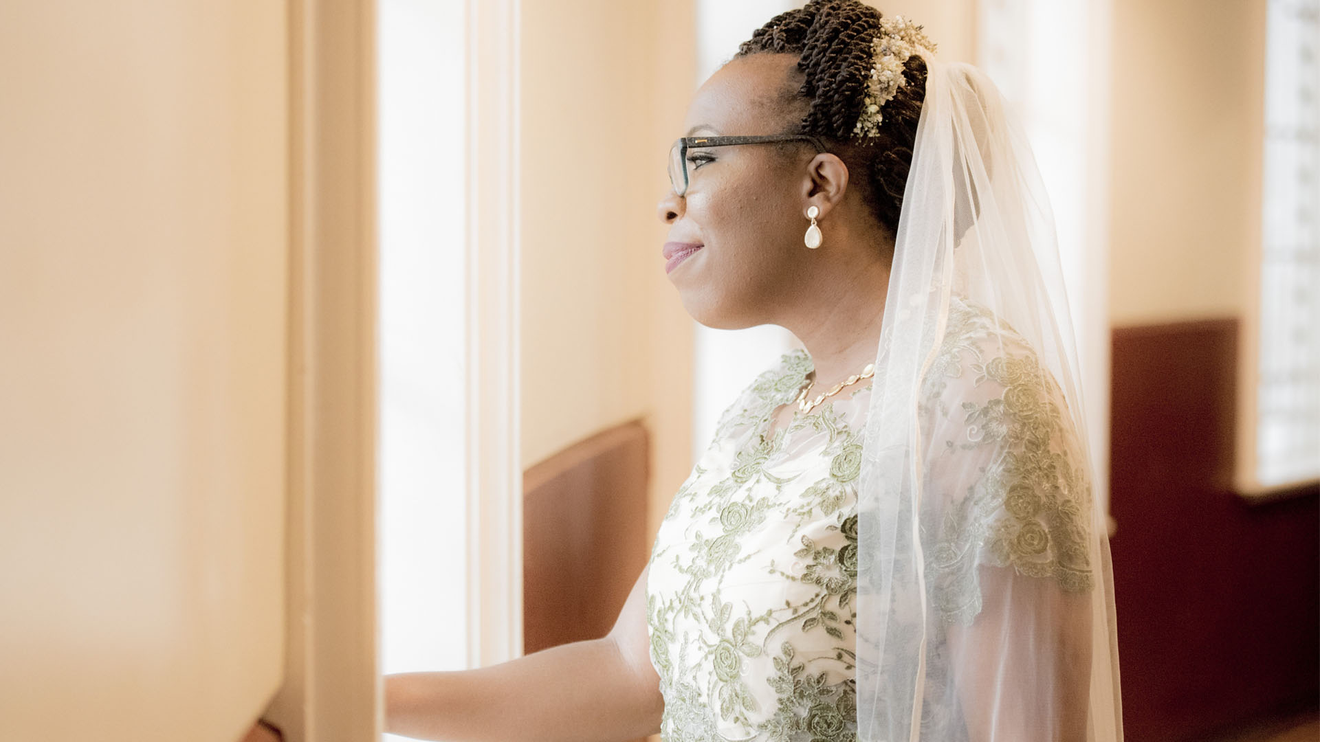 Lace (motifs and trimmings): motifs provide focal detail, while trimmings create definition at edges. The palette of olive green, gold and plum resonates warmly with the wooden interior and golden light of the venue.