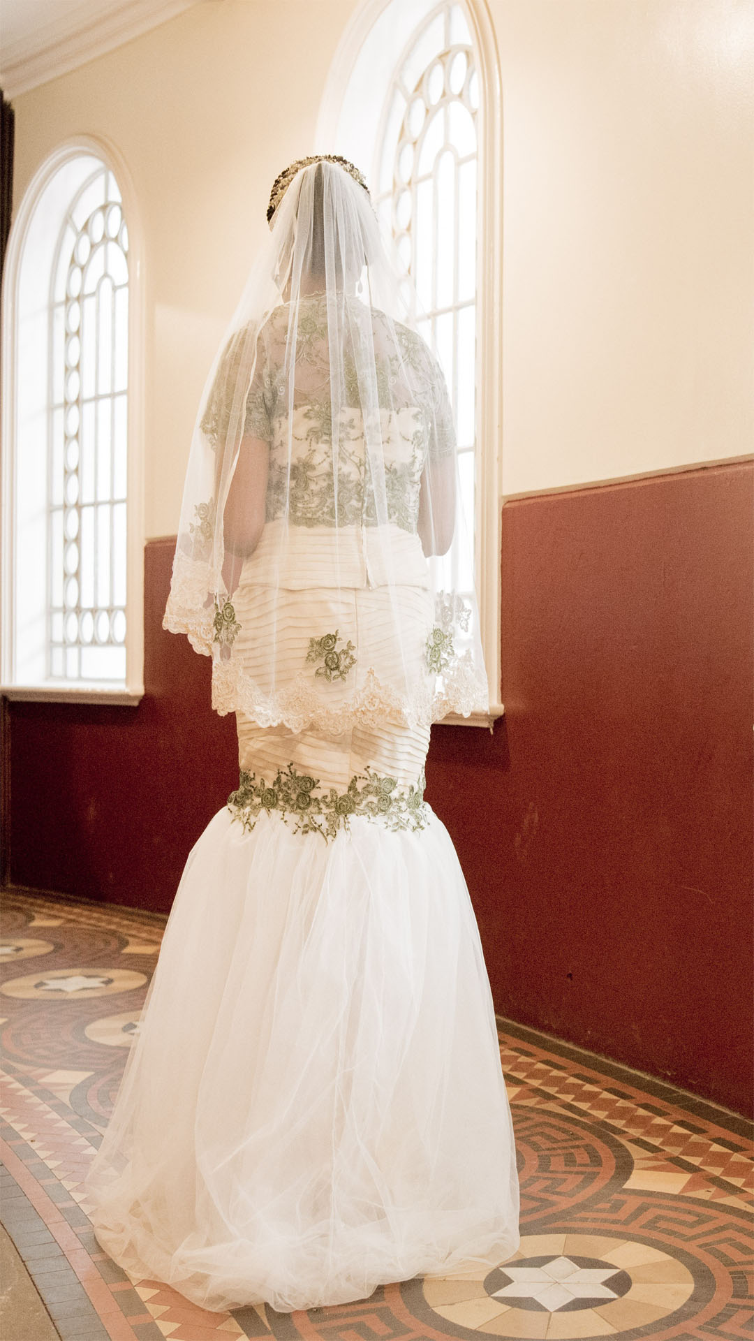 The gown stands out beautifully in the soft light of the venue. The upper part is delicate while the lower part is dramatic, creating a striking contrast. The colour palette of olive green and gold is balanced with the airy transparency of white tulle. The structure is tailored to follow the body with precision, while the layers of fabric give movement and grace. Each step allows the tulle to float lightly, giving the dress a unique presence.