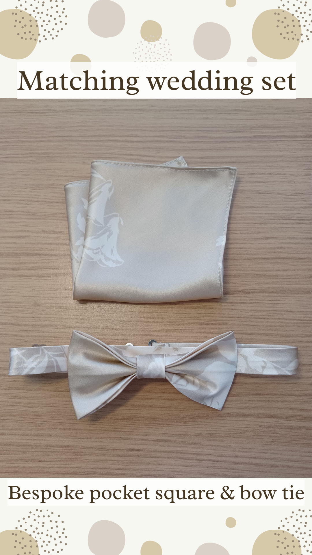 Sustainable Styling: One of the most rewarding parts of this commission was what we did with the remnants. Rather than letting the high-quality silk offcuts go to waste, we used the 30cm of reclaimed fabric to create a bespoke matching set for the groom. We handcrafted a pocket square and a bow tie, ensuring the couple’s wedding attire was perfectly coordinated in both colour and material.