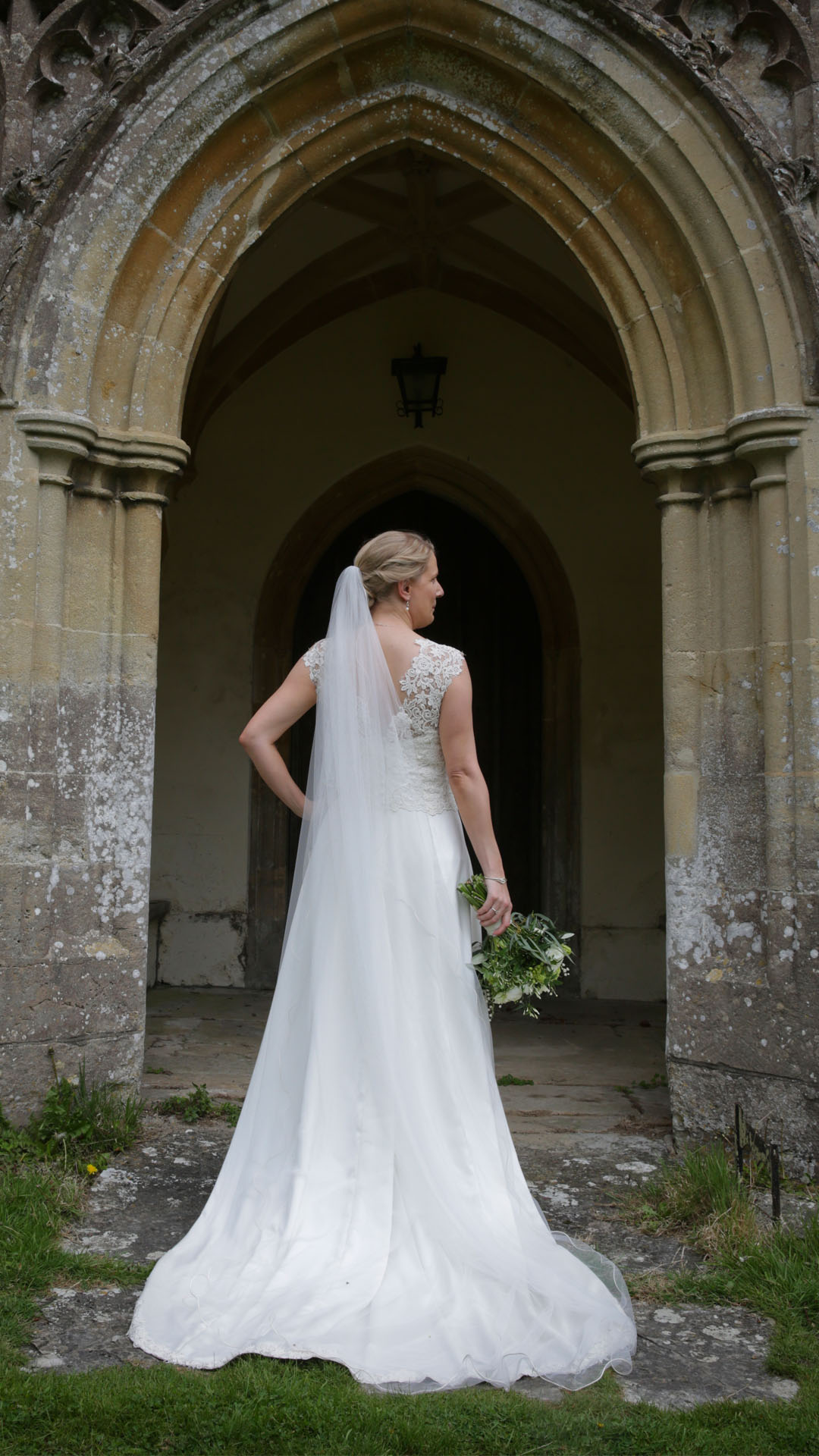 The lace at the hem creates a gentle rhythm as the bride walks, adding subtle movement and charm. This detail brings a timeless, classical quality to the entire look while remaining light and romantic.