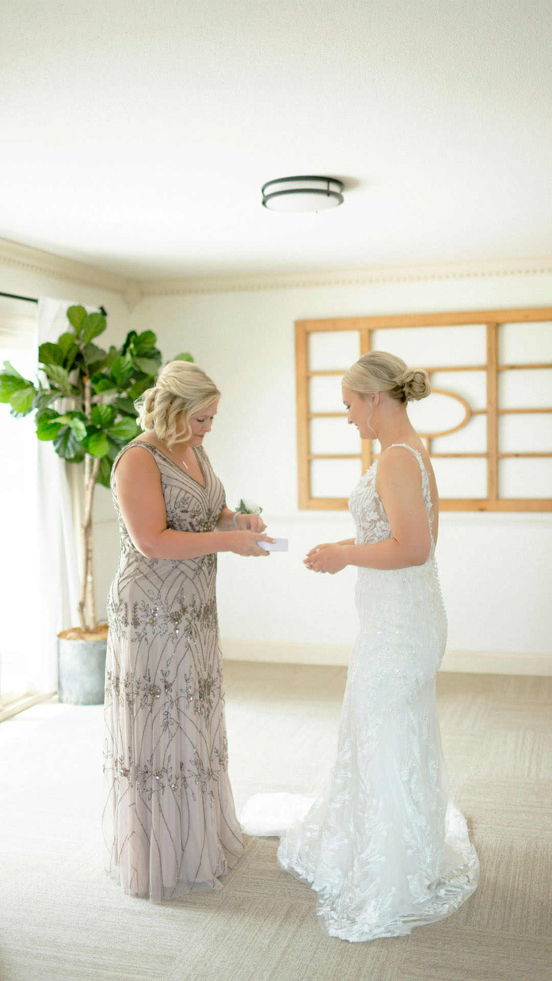 A mother of the bride, dressed in a sophisticated embroidered gown in soft pale mauve, shares an emotional moment by handing a heartfelt gift to the bride before the ceremony.